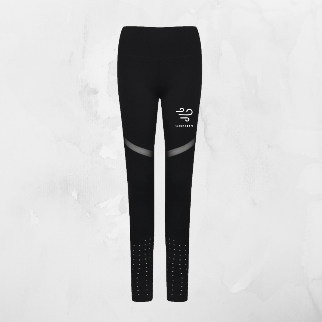 Legging noir avec tissu opaque et extensible. Large ceinture avec poche intérieure. Reste en place même lors de squats. Empiècements en tulle fine sur l'avant et l'arrière de la cuisse.